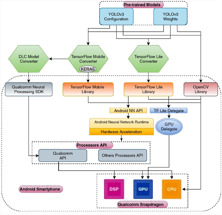 Machine learning algorithms based on convolutional neural networks (CNNs) have recently been explored in a myriad of object detection applications. Nonetheless, many devices with limited computation resources and strict power consumption constraints are not suitable to run such algorithms designed for high-performance computers. Hence, a novel smartphone-based architecture intended for portable and constrained systems is designed and implemented to run CNN-based object recognition in real time and with high efficiency. The system is designed and optimised by leveraging the integration of the best of its kind from the state-of-the-art machine learning platforms including OpenCV, TensorFlow Lite, and Qualcomm Snapdragon informed by empirical testing and evaluation of each candidate framework in a comparable scenario with a high demanding neural network. The final system has been prototyped combining the strengths from these frameworks and led to a new machine learning-based object recognition execution environment embedded in a smartphone with advantageous performance compared with the previous frameworks.